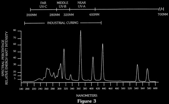 If you require the absence of ozone gases, our engineering department can respond with a special grade of quartz that prevents the 25 nanometer line from reaching oxygen in the atmosphere. Please bear in mind that all effective lines below 254 nanometers are blocked, which may interfere with the curing of some inks. Figure 2 shows the basic area of interest for industrial curing.