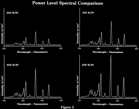 Our 400 watt per inch lamps will more than double the cure when compared to two lamps running 2000 watt per inch. The spectral charts in Figure 5 give a comparison of the ultraviolet output of the voltage lamp operated at 200, 300, 400,and 500 watt per inch by varying the secondary current applies to the lamp.